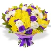 ДЕЛЮКС: хризантема кустовая жёлтая - 10 шт., гербера белая - 7 шт., роза белая - 9 шт., эустома фиолетовая - 9 шт., статица фиолетовая - 7 шт., рускус - 9 шт., фиолетовый фетр., фиолетовая лента.